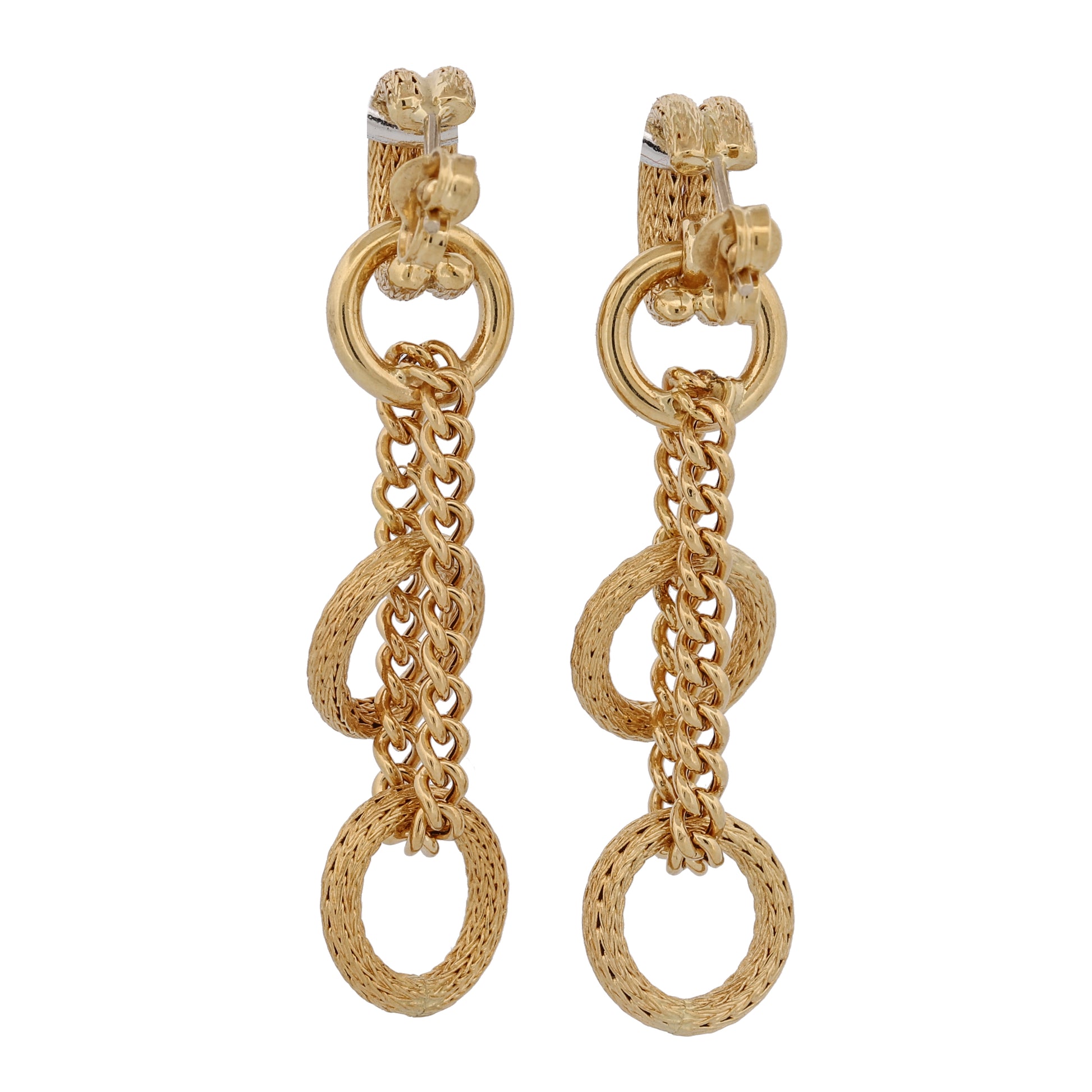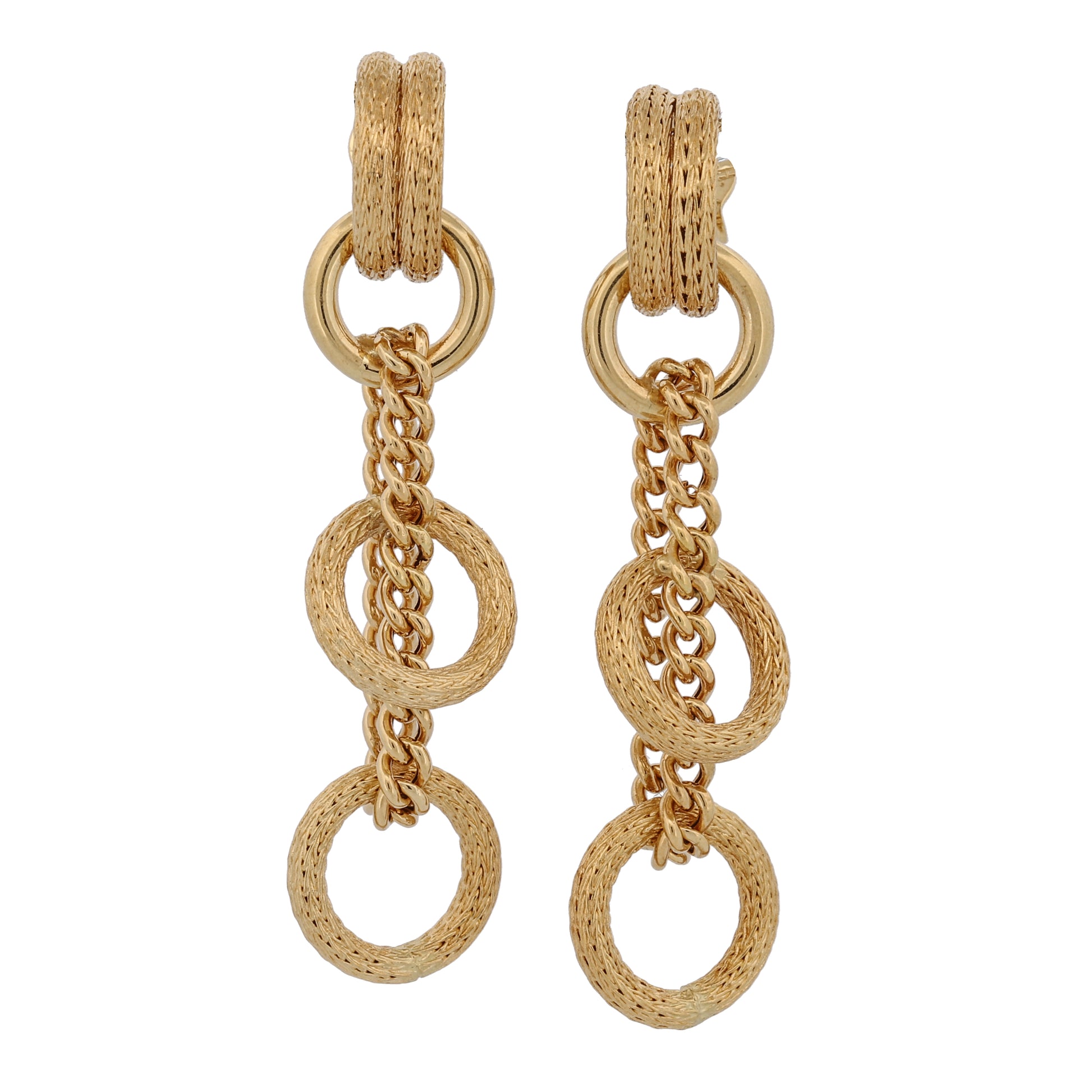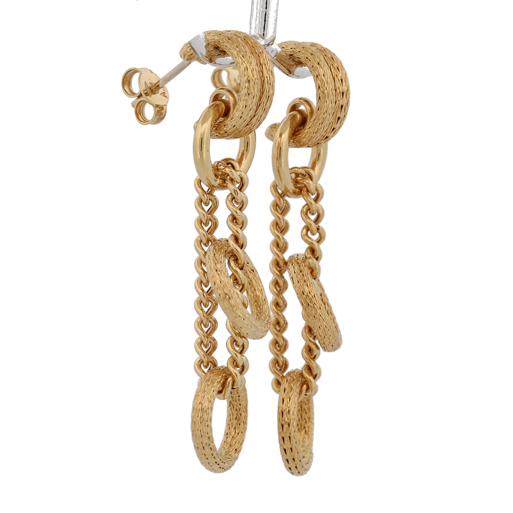 Elevate your style with these stunning 18k yellow gold drop earrings, featuring a unique design that exudes elegance and sophistication. Crafted with meticulous attention to detail, these earrings start with a small C hoop adorned with intricate braided texture, leading to a polished circle attached to a chain with two lower circles, also featuring braided texture.