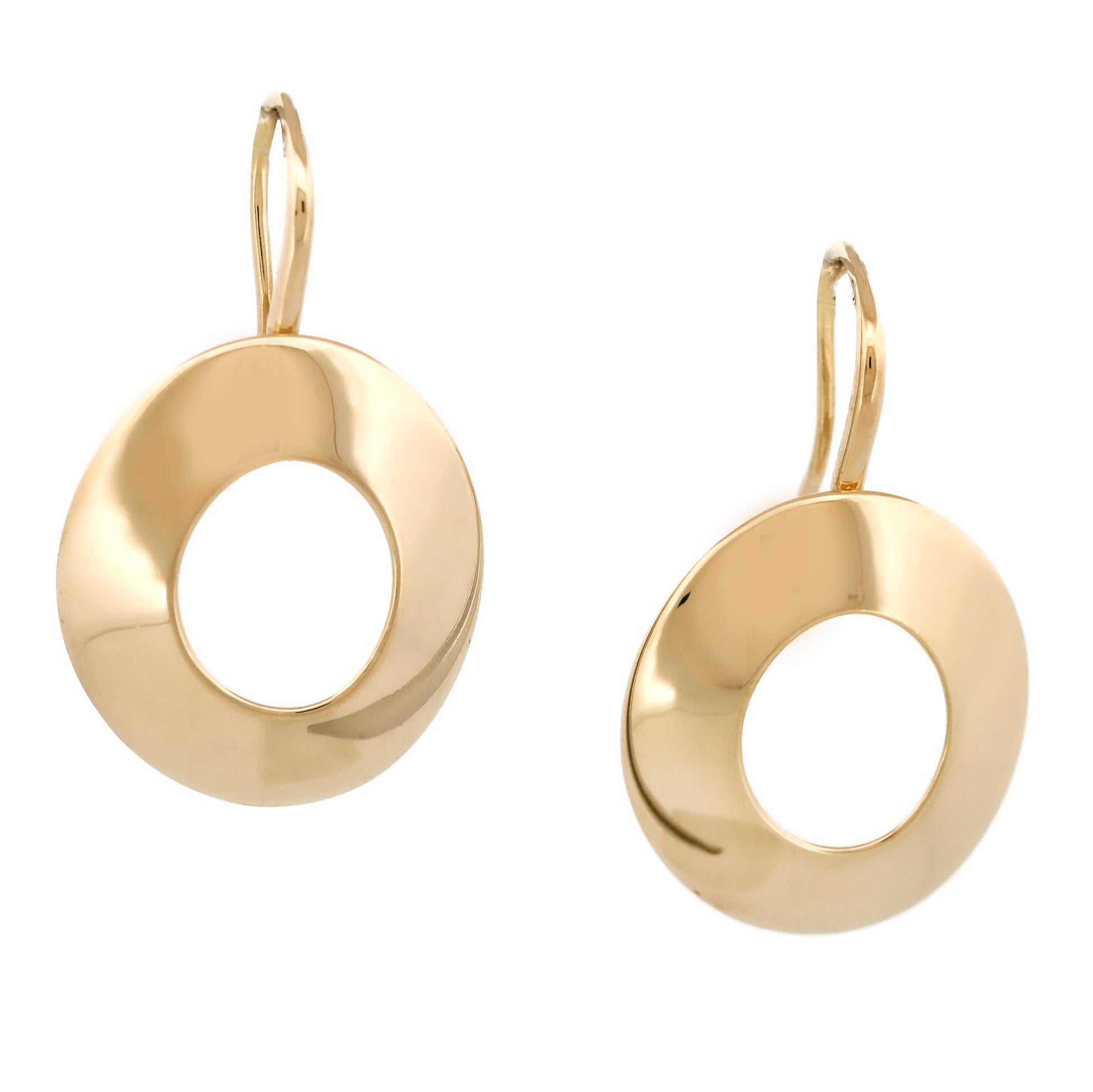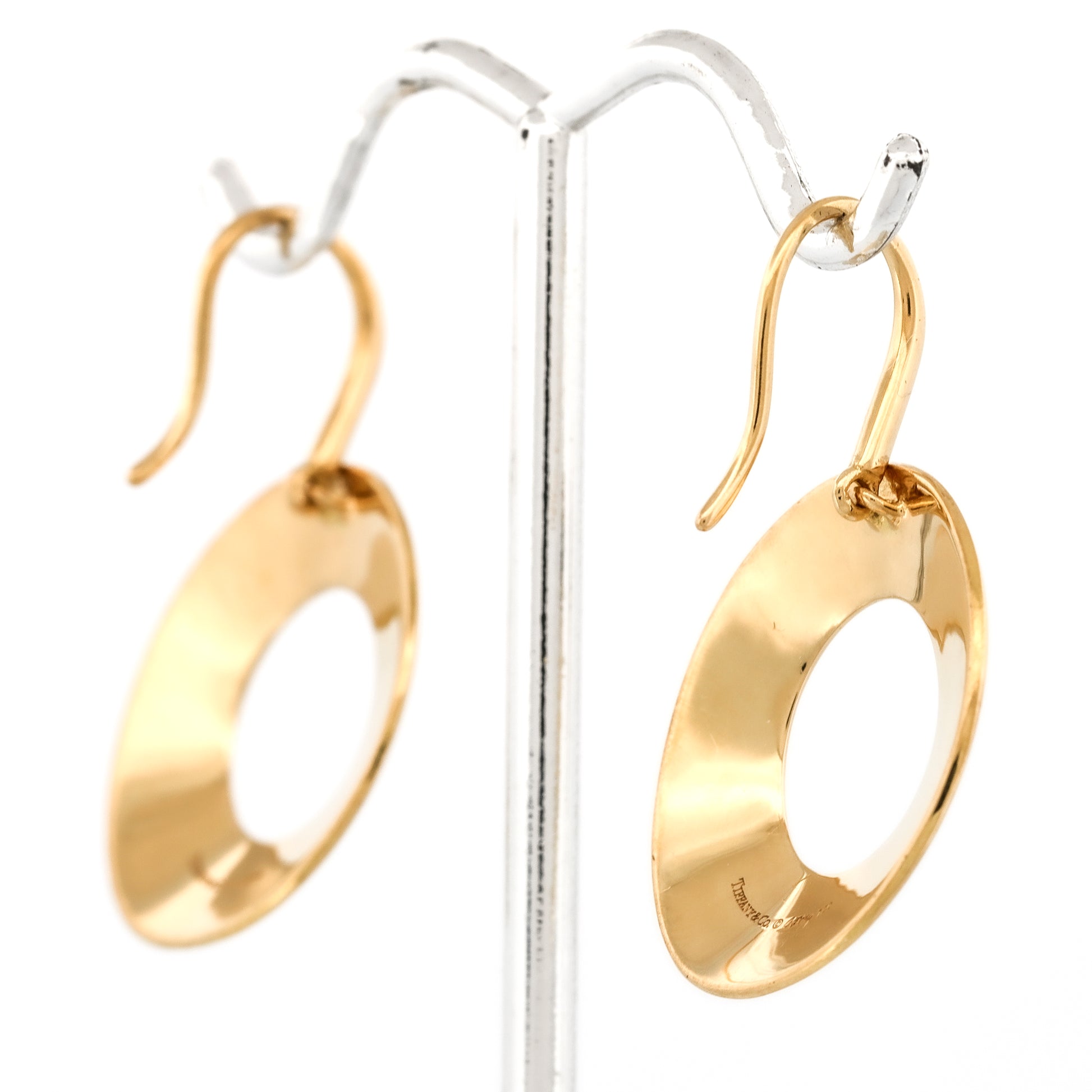 Eleve su estilo con estos excepcionales aretes colgantes Morph de Tiffany & Co. Frank Gehry en oro amarillo de 18 k. Estos aretes encarnan la esencia de la modernidad y el diseño artístico, mostrando un estilo de disco abierto ovalado con un estilo contemporáneo.