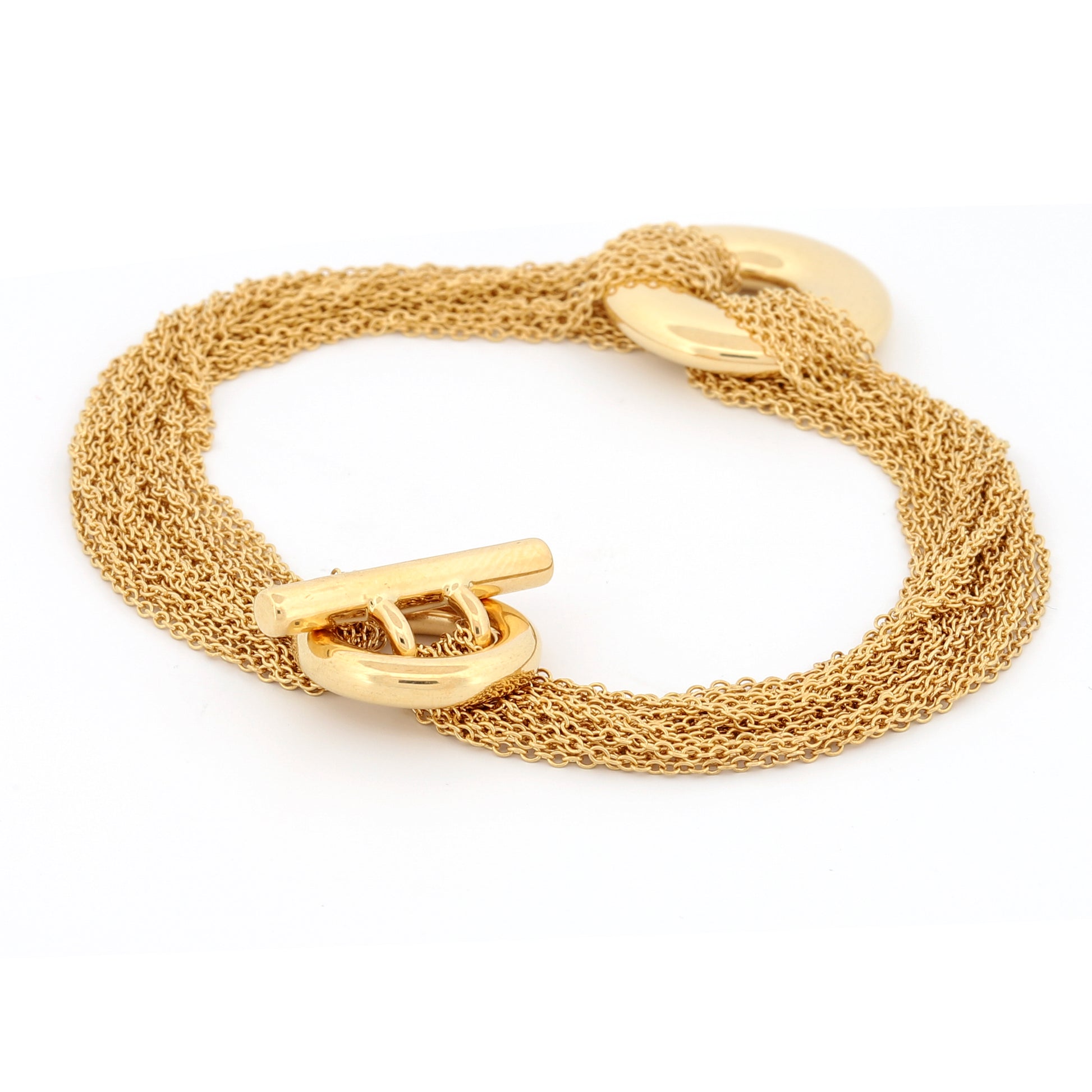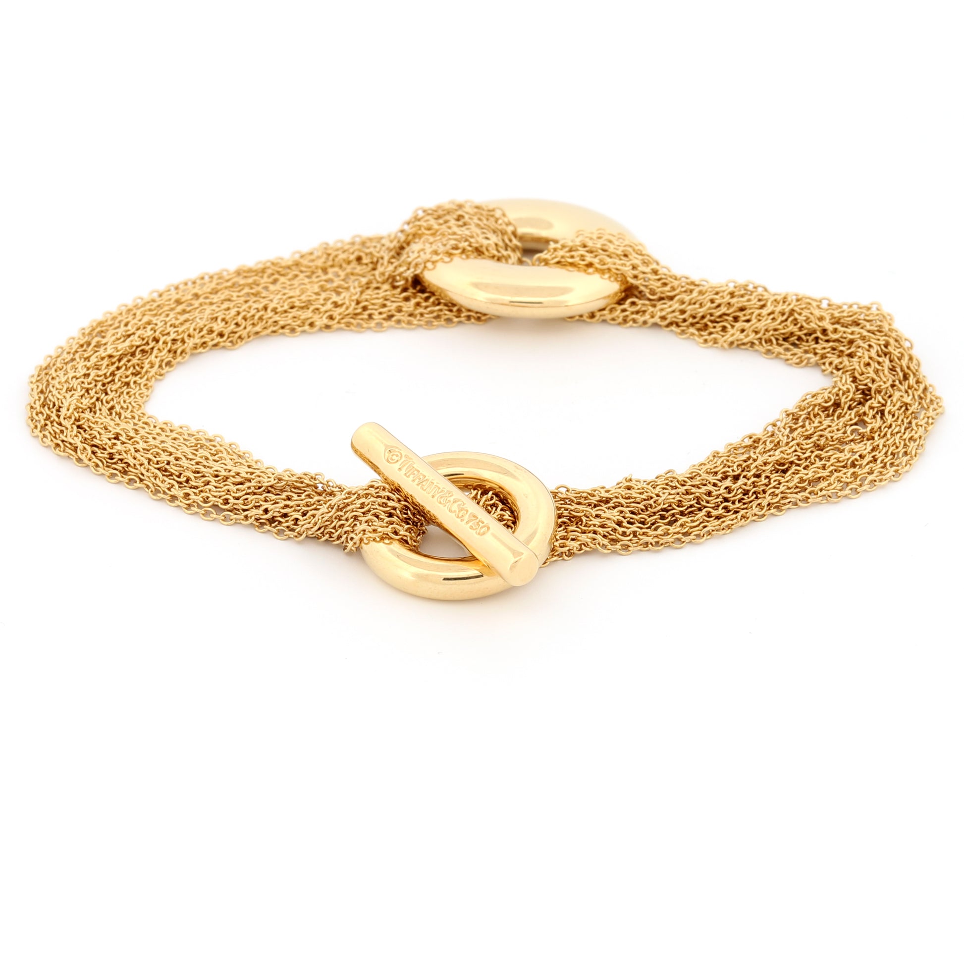 Realce su elegancia con esta exquisita pulsera de múltiples hilos de Tiffany & Co. , un testimonio de la sofisticación atemporal. Elaborada en oro amarillo de 18k , esta pulsera irradia lujo y encanto.