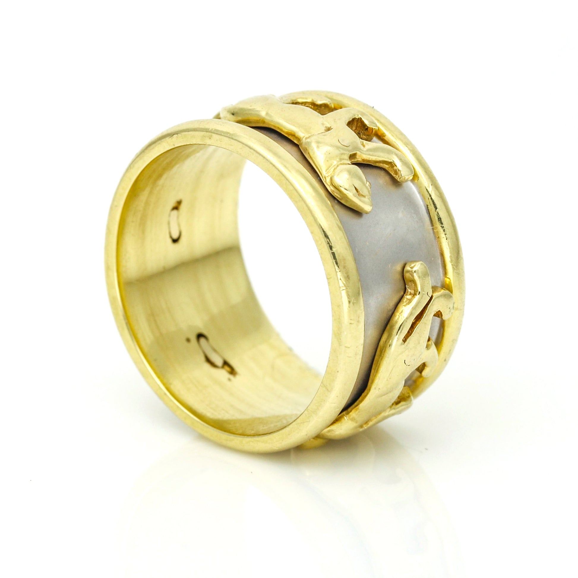 This distinctive Panthers 18k Yellow and White Gold Wide Band Ring is a bold, statement piece. It boasts four polished yellow gold panthers in relief, each a symbol of courage and strength, elegantly prowling around the band.
