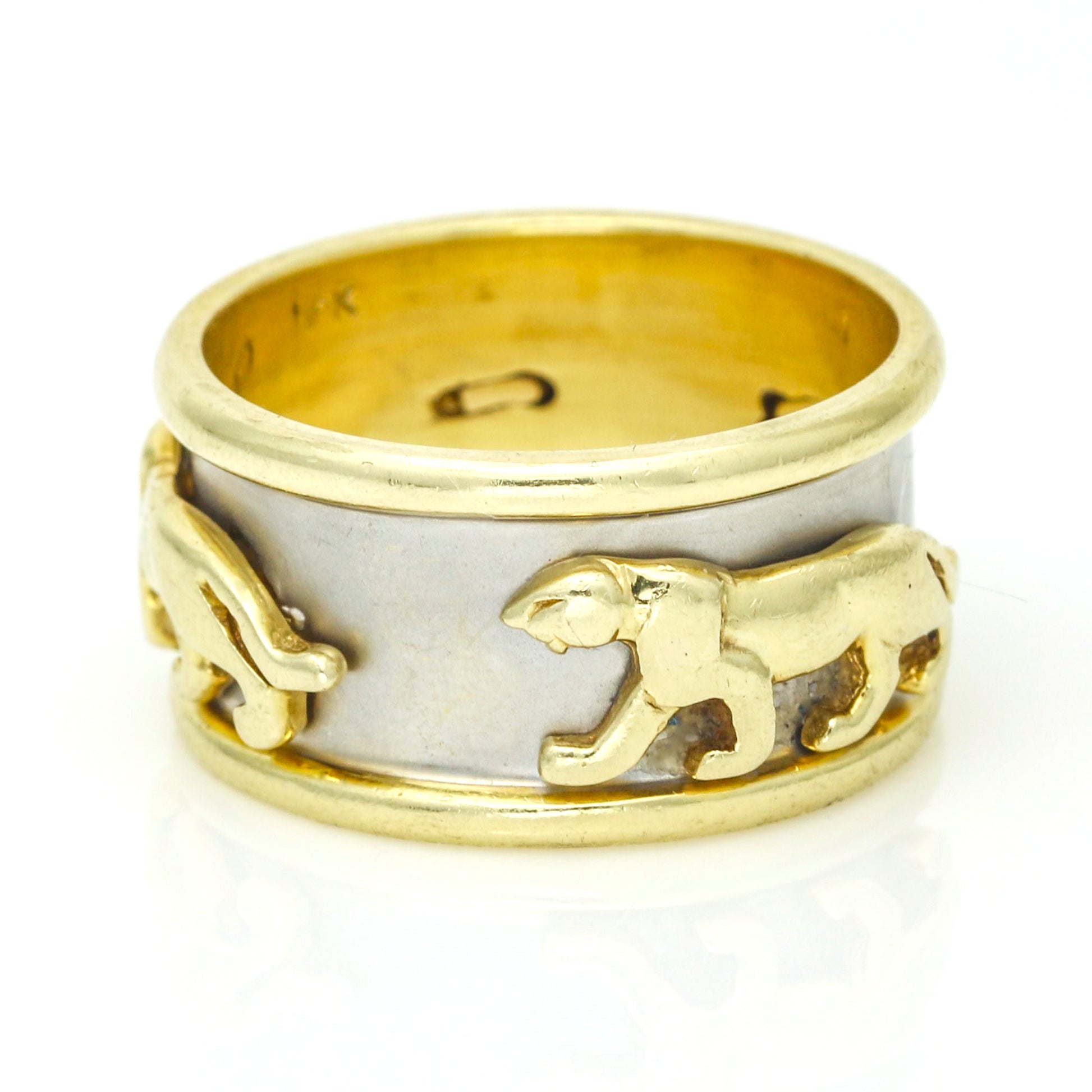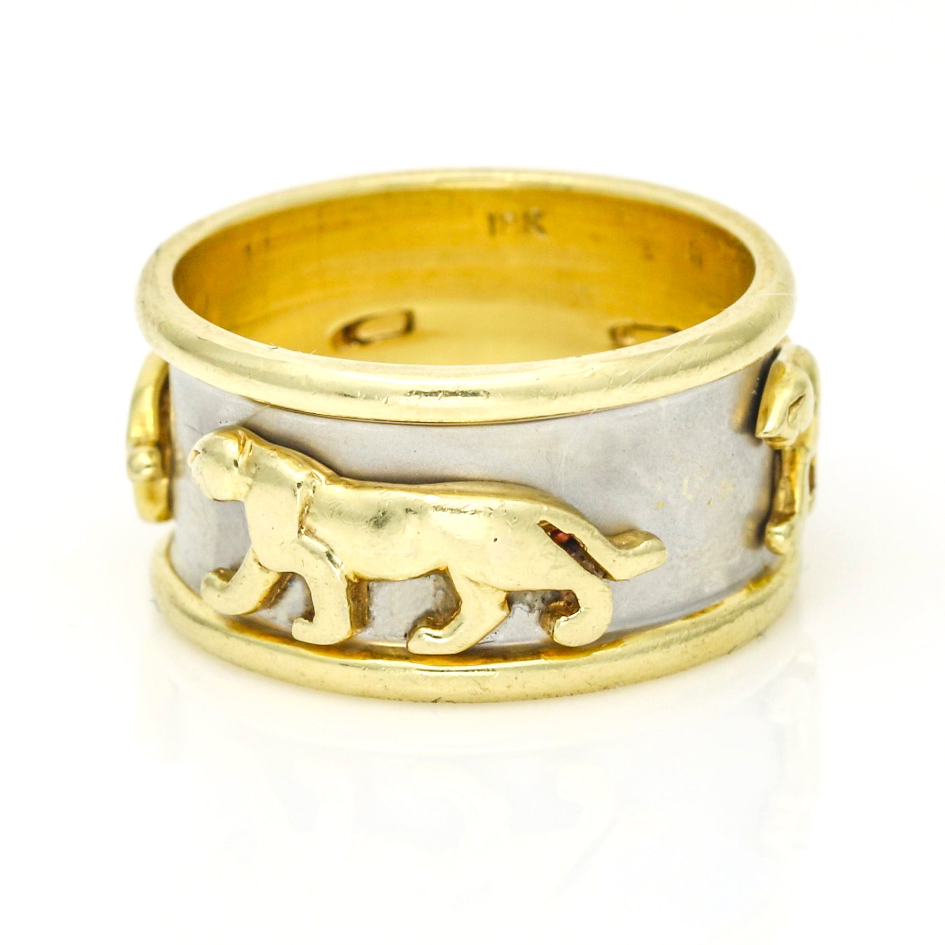 The polished yellow gold panthers against a matte white gold background make a dramatic play of colors and textures that brings the design to life. The yellow gold band edges frame the design, accentuating the ring's wide, bold character.